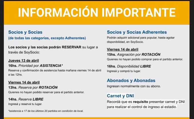 El club informó que el jueves 13 de abril “socios y socias con asistencia al menos a 17 de los últimos 20 partidos en condición de local van a poder verificar su habilitación y confirmar su asistencia a partir de las 16 hs y hasta el viernes 14 de abril a las 12 hs a través de SoySocio”.