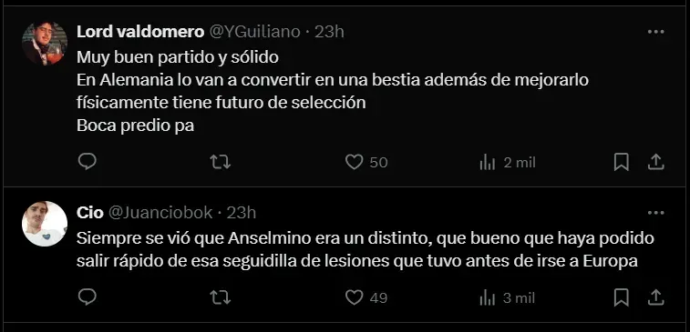 El defensor se mostró muy sólido en defensa. Y también, dio muestra de su gran capacidad para salir jugando de abajo con los volantes. Tanto es así, que después del partido, los hinchas le reconocieron su gran partido en redes: “Es una bestia”, “Cuídenlo” y “Es una piedra”.