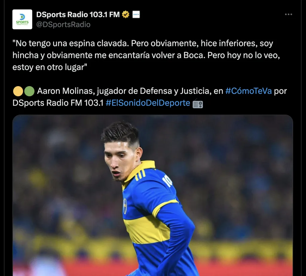 En este contexto, Molinas habló con DSports Radio. Y confesó que está cómodo en su actual club y que no se plantea regresar al Xeneize de momento: “No tengo una espina clavada. Pero obviamente, hice inferiores, soy hincha y obviamente me encantaría volver a Boca. Pero hoy no lo veo, estoy en otro lugar”.