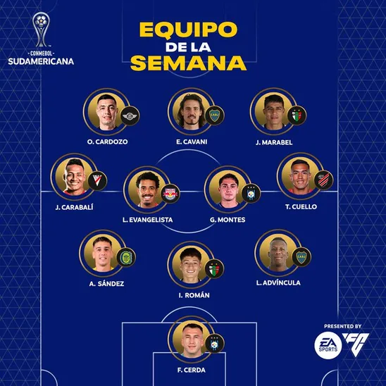 Luego de que finalizaran todos los cruces, el ente que regula el fútbol sudamericano eligió a su once ideal de los cotejos de vuelta. Dentro del mismo hay dos jugadores del Xeneize. Por un lado, está Edinson Cavani, autor del único gol de la serie.