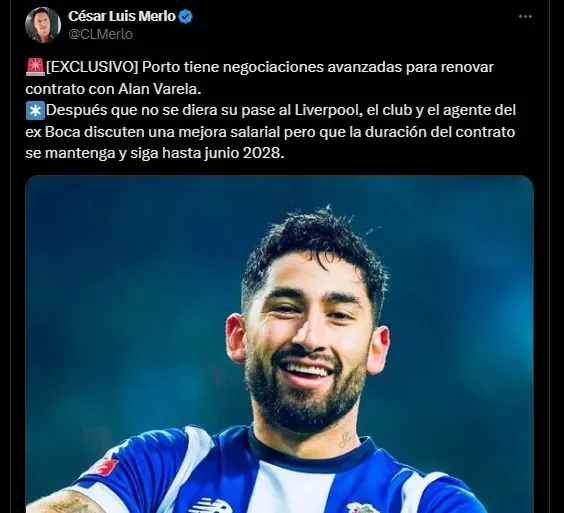 Según reveló el periodista César Luis Merlo, Alan Varela y Porto tienen negociaciones avanzadas para renovar el contrato del volante central. Y la situación se está dando después de lo que fue el interés de clubes europeos por el jugador.