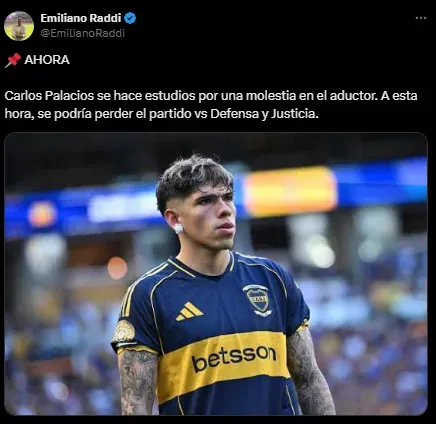 Según informó el periodista Emiliano Raddi de Planeta Boca Juniors, se trata de Carlos Palacios. El chileno tuvo una molestia en el aductor y ahora su presencia está en duda contra el Halcón en Florencio Varela.