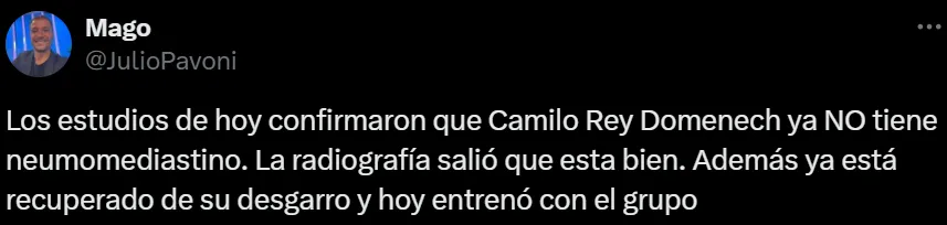 El periodista Julio Pavoni, informó en su cuenta de X (Twitter), que el mediocampista se sometió a estudios y los mismos arrojaron que ya no padece neumomediastino, la extraña enfermedad que lo tenía a maltraer hace varios días. De esta manera, este jueves se pudo entrenar junto a sus compañeros, luego de estar apartado por esta afección.