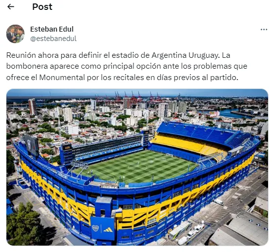 “Reunión ahora para definir el estadio de Argentina-Uruguay. La Bombonera aparece como principal opción ante los poblemas que ofrece el Monumental por los recitales en días previos al partido“, informó el panelista que sigue la actualidad de la Selección Argentina en ESPN F12. Las otras opciones: que se juegue en el estadio de River a pesar de sus condiciones o que se confirme la sede en la capital de la Provincia de Córdoba (la que está oficializada pero, en este momento, parece ser la más difícil).