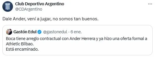 El conjunto dirigido por Fernando Gago iniciará su camino en la Copa Argentina contra Argentino de Monte Maíz y el cuadro cordobés ya había sido viral por otros posteos anteriores. Ahora, se sumó a la posible llegada del ex Manchester United y bromeó en redes sociales. “Dale Ander, vení a jugar, no somos tan buenos”, publicaron, en “X” (Twitter) haciendo alusión a una frase del expresidente de River, Rodolfo D’Onofrio.