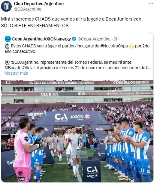 Pero no fue el único tuit de este club que milita en el Torneo Federal A que llamó la atención de muchos. Desde la cuenta oficial de la Copa Argentina felicitaron a esta institución por disputar el partido inaugural por segunda vez consecutiva, utilizando el término “chads”. A lo que la cuenta oficial del rival de Boca respondió: “Mira si seremos CHADS que vamos a ir a jugarle a Boca Juniors con solo siete entrenamientos”.