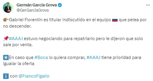 ¿De qué se trata? El periodista Germán García Grova junto a Franco Figallo indicaron que “en caso de que Boca lo quiera comprar, Argentinos tiene la prioridad para igualar la oferta”. Además, resaltaron que el Bicho estuvo negociando para repatriarlo pero, desde Oremburg le respondieron que el volante, titular indiscutido en el conjunto ruso, solo sale por una venta. Con un puñado de días para que finalice el periodo para realizar transferencias, el Único Grande no se da por vencido y va por un mediocampista ofensivo.