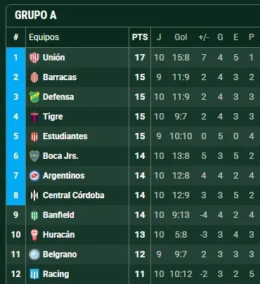 Con diez partidos disputados hasta el momento, el cuadro de la Ribera se ubica en el sexto lugar de la Zona A con 14 unidades, al igual que Argentinos, Central Córdoba y Banfield, pero la diferencia de gol beneficia a Boca. A la espera del partido de Belgrano, el conjunto azul y oro se mantiene en la lucha para los playoffs.