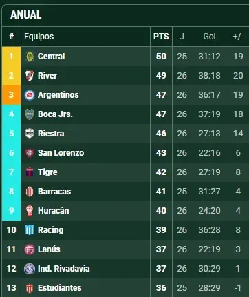 El rival de toda la vida cayó ante Deportivo Riestra y se mantuvo en el segundo de la tabla general con 49 puntos. Y ante este resultado, el conjunto azul y oro está fuera de la zona de clasificación, pero a tan solo tres puntos de Rosario Central, quien mira a todos desde lo más alto.