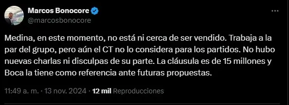 Según informó el periodista Marcos Bonocore, Cristian Medina en este momento no está ni cerca de ser vendido al Fenerbahçe. Y reveló que no hubo nuevas charlas ni disculpas de su parte.