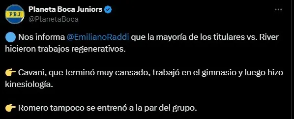 La información fue revelada por el periodista Emiliano Raddi para Planeta Boca, fuente que confirmó que ambos ex jugadores del Manchester United no entrenaron junto a sus compañeros. El delantero terminó muy cansado, trabajó en el gimnasio y después hizo kinesiología. Por su parte, el resto del plantel realizó trabajos regenerativos pensando en el partido contra los brasileros.