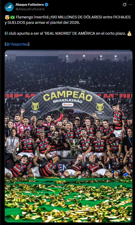 Según reveló R7Esportes, Flamengo invertirá 190 millones de dólares entre fichajes y sueldos para el armado del plantel del próximo año. La idea es convertirse en el “Real Madrid de Sudamérica“.