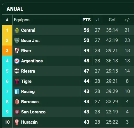 Con la última victoria ante Newell’s en La Bombonera, llegó a 50 unidades y se ubicó como escolta de la Tabla Anual por detrás de Rosario Central, quien volvió a sumar y estiró la ventaja con sus 56 unidades. La derrota del Millonario lo deja con 49 puntos y en caso de sumar de a tres en el próximo duelo, el rival de toda la vida complicará sus aspiraciones para esta clasificación.