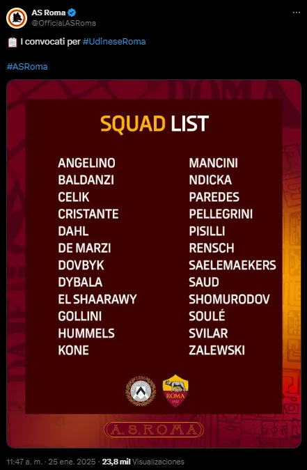 Mientras tanto, el volante sigue vistiendo la camiseta del equipo de la capital italiana. Este domingo enfrentará al Udinese y el entrenador Claudio Ranieri decidió convocar a Paredes para el encuentro.