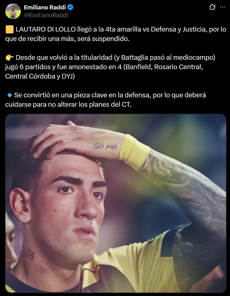 En caso de ver la quinta, se perderá el partido frente a Barracas Central, rival directo en la Zona A del Torneo Clausura. A su vez, desde que volvió a ser titular y cuando Battaglia pasó al mediocampo, en los últimos 6 cotejos Di Lollo recibió 4 tarjetas amarillas.