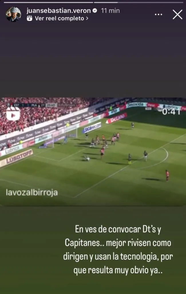 A través de sus redes sociales, Juan Sebastián Verón se quejó del arbitraje del candidato a dirigir el Superclásico y escribió: “En vez de convocar entrenadores y capitanes, mejor revisen como dirigen y usan la tecnología. Resulta muy obvio ya”.