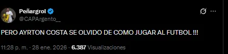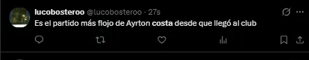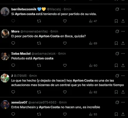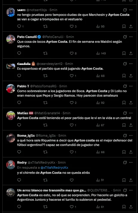 “Se olvidó de cómo jugar“, “Fue su peor partido“, “Es increíble“, “Venía jugando muy bien“, fueron algunas de las palabras que recibió el central por parte de los fanáticos en X (Twitter). La realidad es que venía siendo figura en algunos encuentros por su firmeza, pero en el encuentro de esta noche realmente nada salió como esperaba.