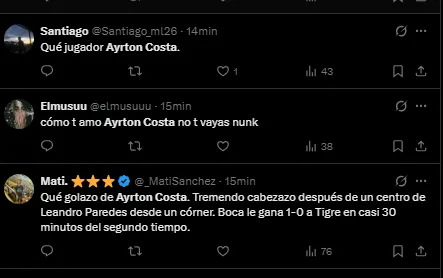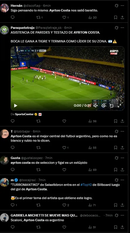 Un futbolista del Xeneize fue muy elogiado en redes sociales por su rendimiento contra el Matador. Se trata de Ayrton Costa, quien marcó el primer gol del partido para el local y tuvo una gran tarea en el fondo no dejando pasar nunca a los rivales.
