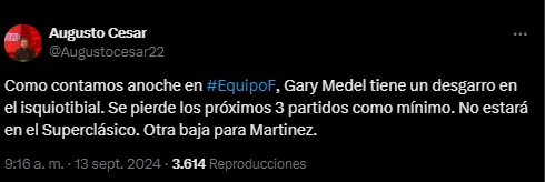 Según confirmó el periodista Augusto César, Medel tiene un desgarro en el isquiotibial. “Se pierde los próximos 3 partidos como mínimo. No estará en el Superclásico. Otra baja para Diego Martinez”.