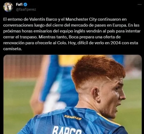 Lo que fue una de las novelas del último mercado de pases ahora parece retomarse. Se volvió a reflotar el interés de Manchester City por Valentín Barco, joven estrella de Boca con tan solo 19 años. Y ya se saben los detalles del caso.
