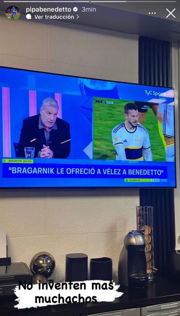 “No inventen más, muchachos”, escribió el ‘Pipa’ en la cuenta de su red social de Instagram, con su televisión de fondo con el graph del programa que decía ‘Bragarnik le ofreció a Vélez a Benedetto’. Por el momento, el 9 descartó una pronta transferencia lejos del Xeneize.