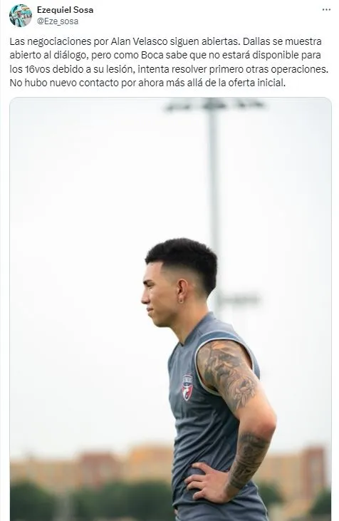 El Xeneize busca a varios futbolistas para el segundo semestre y uno de ellos es Alan Velasco, quien se recupera de una rotura de ligamentos cruzados. De acuerdo a la información que brindó Ezequiel Sosa, el cuadro de la Ribera sabe que no estará disponible para los 16avos por su lesión y por ello, intenta resolver primero otras operaciones.
