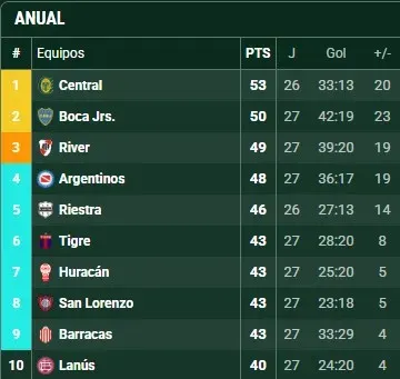 Actualmente, cuenta con 50 unidades y se ubica como escolta de Rosario Central, quien aparece en lo más alto tras superar en el Gigante de Arroyito a River. Con 15 puntos en juego, los próximos duelos serán claves y hay un dato a tener en cuenta: la penúltima fecha será ante el Millonario, uno de los rivales directos.