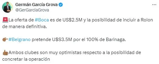 El periodista Germán García Grova dio más detalles al respecto e indicó que el Consejo de Fútbol ya envió una oferta. La misma es de 2.5 millones de dólares más la posibilidad de incluir a Rolón de manera definitiva. Por su parte, las autoridades del Pirata pretenden 3.5 millones de dólares por la totalidad del pase. Se vienen días claves para la resolución de esta negociación.