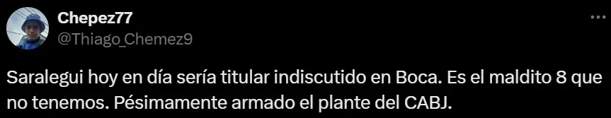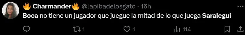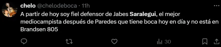 Tras haber eliminado a San Lorenzo, el surgido en Boca Predio redondeó una buena actuación generando lamento en algunos hinchas por el nivel que está mostrando en otro club. “Saralegui hoy en día sería titular indiscutido en Boca. Es el 8 que no tenemos”, “A partir de hoy soy fiel defensor de Jabes Saralegui, el mejor mediocampista después de Paredes que tiene Boca” y “Saralegui sería el jugador número 12 de este Boca, es insólito que no lo repesquen”, fueron algunos de los comentarios de parte de los hinchas.