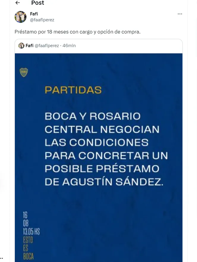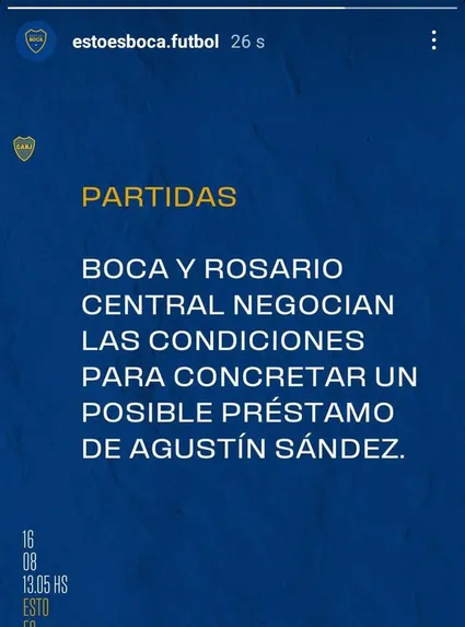 Así lo informó el club a través de su cuenta oficial para brindar novedades del mercado de pases “Esto es Boca Fútbol”. “Boca y Rosario Central negocianla condiciones para concretar un posible préstamo de Agustín Sández”.