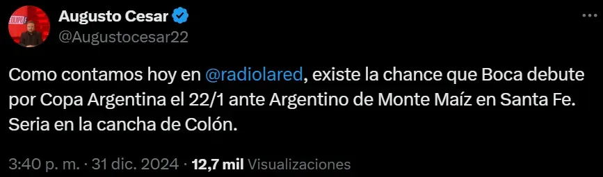 Debido a esta situación, la propuesta de la organización de la Copa Argentina 2025 a Boca fue jugar el partido de los 32avos de final ante Argentino de Monte Maíz en la semana previa al inicio de la Liga Profesional 2025, según informó el periodista Augusto César en Radio La Red.
