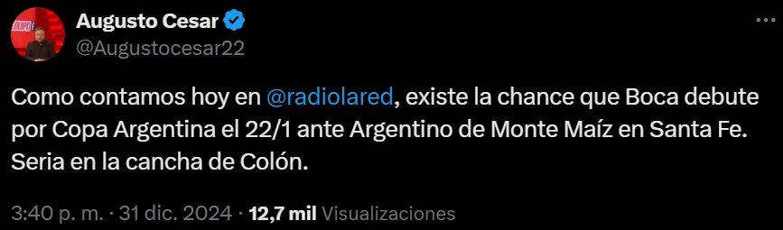 Debido a esta situación, la propuesta de la organización de la Copa Argentina 2025 a Boca fue jugar el partido de los 32avos de final ante Argentino de Monte Maíz en la semana previa al inicio de la Liga Profesional 2025, según informó el periodista Augusto César en Radio La Red.