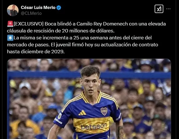 Boca le renovó su contrato a Camilo Rey Domenech. Y, si bien el juvenil sigue teniendo vínculo con el club hasta finales del 2029, lo que cambió fue el salario del volante y su cláusula de salida. Según reveló el periodista César Luis Merlo, Camilo Rey Domenech ahora cuenta con una cláusula de salida de 20 millones de dólares.