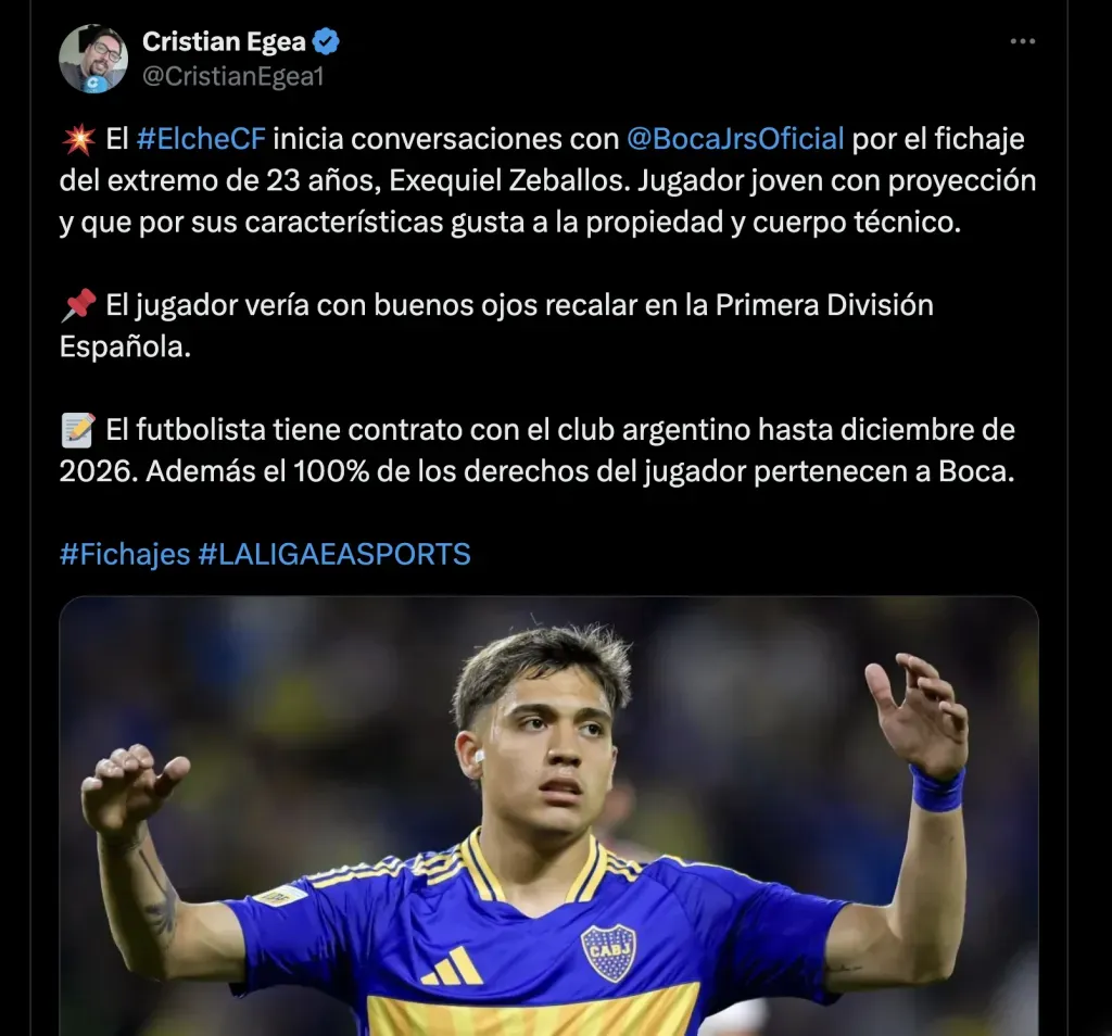 Y quien lo contó fue el periodista español Cristian Egea en su cuenta de “X”: “El Elche inicia conversaciones con Boca por el fichaje del extremo de 23 años, Exequiel Zeballos. Jugador joven con proyección y que por sus características gusta a la propiedad y cuerpo técnico”.