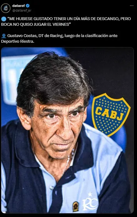 Racing superó a Riestra por 3 a 0 por los octavos de final de la Copa Argentina. Y después de esto, Gustavo Costas (DT de la Academia) habló en conferencia de prensa y se refirió al partido que se le viene contra Boca. Y dejó una insólita queja.