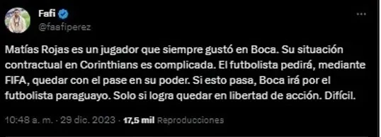 El paraguayo mantiene una deuda con el conjunto de San Pablo y esto podría acelerar su salida a tan solo meses de haber llegado. La situación puede desembocar en que Rojas tome acciones legales contra el club y, según el periodista Facundo Pérez, esto podría terminar en un pedido de Matías a FIFA para pedir la libertad de acción.
