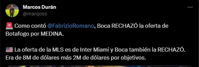 Al igual que Marcos Rojo, Inter Miami se vio interesado en contratar a Cristian Medina para el 2024. El club de la MLS ofertó 8 millones de dólares por el fichaje del juvenil, información que fue revelada por Marcos Durán del Dario Relevo de España. Sin embargo, desde Boca, ya elevaron una respuesta.