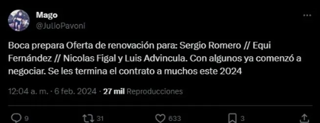 Según pudo contar el periodista Julio Pavoni en su cuenta de Twitter, Boca quiere asegurar la continuidad de 4 futbolístas a futuro: Sergio Romero, Luis Advíncula, Equi Fernández y Nicolás Figal.