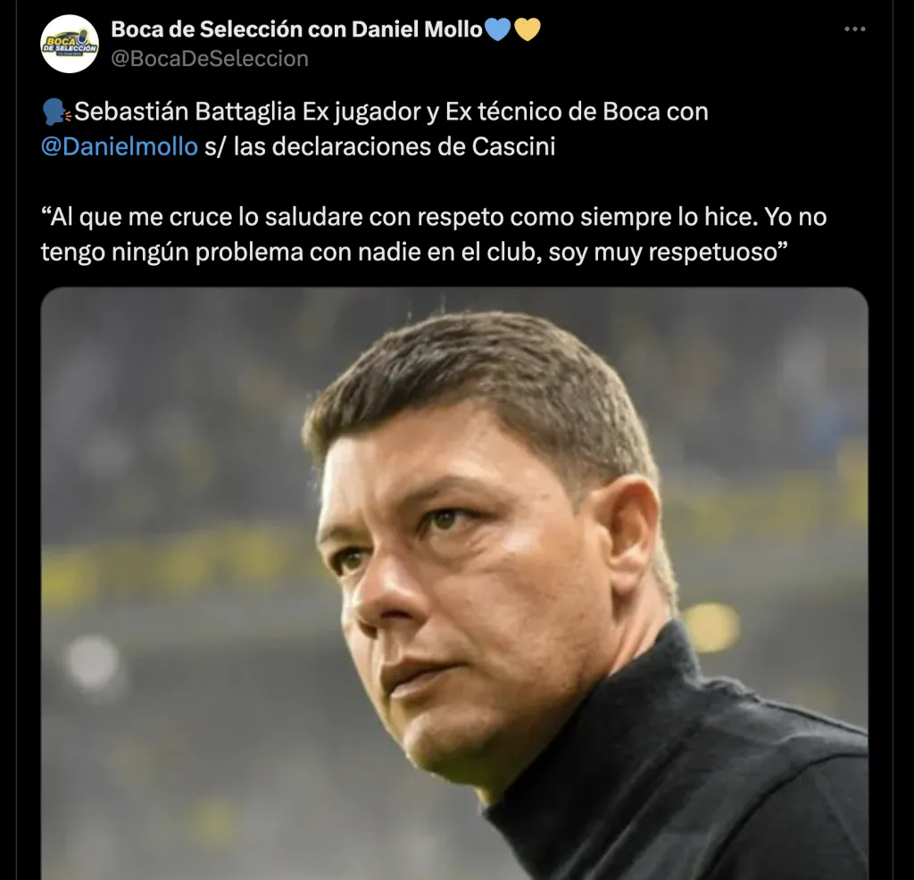 Y hace unas horas, en el programa “Boca de Selección” en Radio del Plata, Battaglia respondió: “Al que me cruce lo saludaré con respeto como siempre lo hice. Yo no tengo ningún problema con nadie en el club, soy muy respetuoso”.