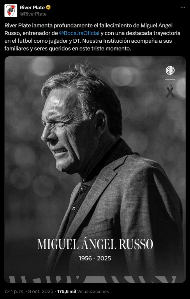 Varios equipos del fútbol argentino se expresaron en redes por el fallecimiento de Russo. Uno de los que emitió un sentido comunicado al conocer la noticia fue River. El club de Núñez posteó un emotivo mensaje para despedir al DT de Boca. “River Plate lamenta profundamente el fallecimiento de Miguel Ángel Russo, entrenador de Boca Juniors y con una destacada trayectoria en el fútbol como jugador y DT. Nuestra Institución acompaña a sus familiares y seres queridos en este triste momento”, manifestó River de manera oficial.