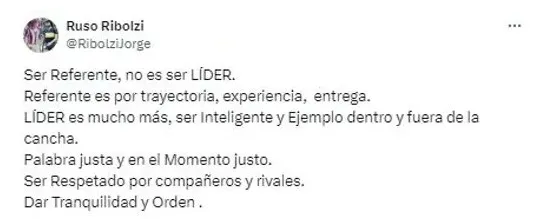 Y además, agregó: “LÍDER es mucho más, ser inteligente y ejemplo dentro y fuera de la cancha. Palabra justa y en el momento justo. Ser respetado por compañeros y rivales. Dar tranquilidad y orden“.