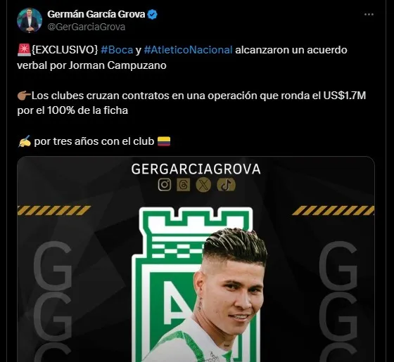 Boca arregló la salida de Jorman Campuzano en este mercado de pases. Y, según el periodista Germán García Grova, el Xeneize le vende el 100% del pase a Atlético Nacional de Colombia. ¿El monto de la transferencia? 1.7 millones de dólares y firmará por 3 temporadas.