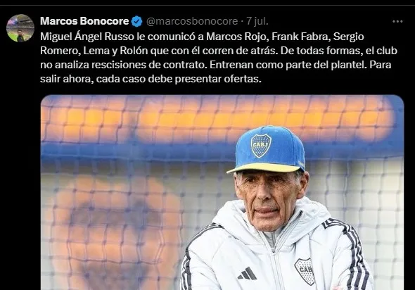 Estos jugadores no fueron los únicos que recibieron este comunicado. Y así lo contó el periodista Marcos Bonocore: “Miguel Ángel Russo le comunicó a Marcos Rojo, Frank Fabra, Sergio Romero, Lema y Rolón que con él corren de atrás. De todas formas, el club no analiza rescisiones de contrato. Entrenan como parte del plantel. Para salir ahora, cada caso debe presentar ofertas”.