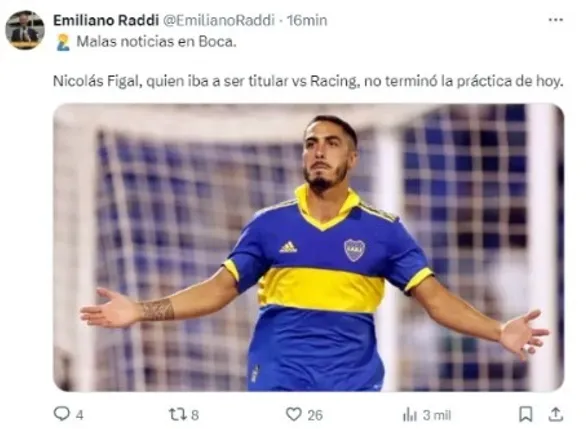 Nicolás Figal no estará en La Bombonera para el partido de Boca vs. Racing según lo informado por le periodista Emiliano Raddi para Planeta Boca. ¿El motivo? Un esguince de ligamento lateral interno en la rodilla izquierda. Su lugar fue ocupado por Nicolás Valentini.