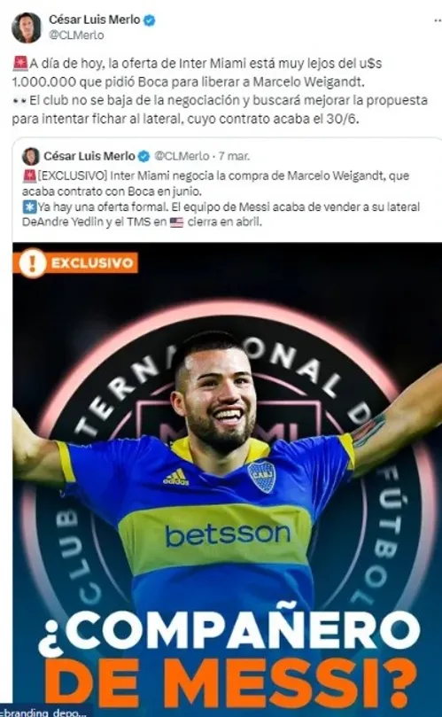 El Inter Miami es el equipo que pretende al lateral y, por ello, Boca le pidió 1 millón de dólares por el pase del jugador. Sin embargo, esta cifra fue rechazada. Según informó el periodista César Luis Merlo, la oferta del equipo de Lionel Messi está muy lejos del millón de dólares que pidió Boca. No obstante, no se descarta que los de la MLS mejoren la oferta nuevamente.