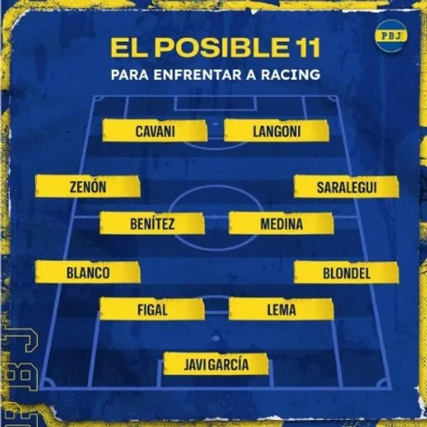 De esta manera, el probable equipo de Boca vs. Racing quedó conformado de la siguiente manera: Javier García; Lucas Blondel, Cristian Lema, Nicolás Figal, Lautaro Blanco; Jabes Saralegui, Mauricio Benítez, Cristian Medina, Kevin Zenón; Luca Langoni y Edinson Cavani.