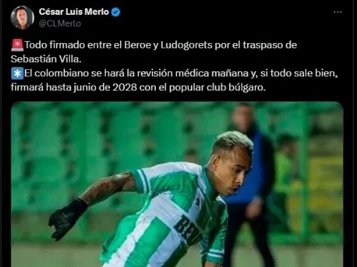 Sebastián Villa dejará de ser jugador del Beroe Stara Zagora de Bulgaria y firmará por un club europeo que jugará la UEFA Champions League: Ludogorets, equipo que también milita en el país búlgaro.