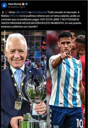 Sin embargo, fue el mismo Victor Blanco quien desestimó esta opción en TyC Sports: “Está cerrado el mercado. A Rojas no lo pudimos retener por un tema salarial, pedía un contrato que no podíamos pagar, de hecho hoy está libre, y no podemos hacer ninguna negociación en este momento, después se verá. Además en ese puesto estamos cubiertos con Juanfer (Quintero)”.