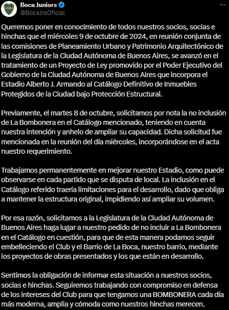 En los últimos días se dio a conocer que La Bombonera estaba dentro de un proyecto de ley de la Legislatura Porteña para ser monumento histórico. Esto implicaría no poder hacerle modificaciones si se promulga como tal. El Xeneize expresó su preocupación a través de un comunicado en el que, entre otras cosas, señalaron que tienen “la intención y el anhelo de ampliar su capacidad“.