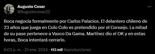 Boca ya negocia formalmente por Carlos Palacios, delantero de 23 años de Colo Colo de Chile. La información fue brindada por el periodista Augusto César quien, además de esto, agregó: “Martínez ya dio el OK e intentarán cerrarlo en las próximas horas“.